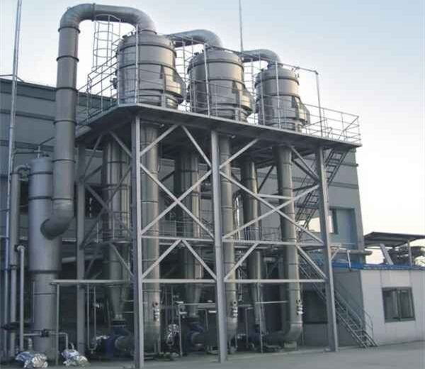 三效蒸發(fā)器主要由相互串聯(lián)的蒸發(fā)器、冷凝器、鹽分離器以及復(fù)制設(shè)備等組成三組蒸發(fā)器,以串聯(lián)的形式組成一整套的三效蒸發(fā)系統(tǒng)。
